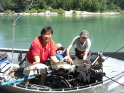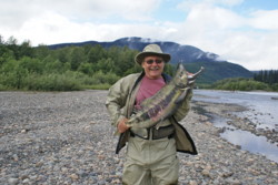 July 22 Terrence Reynolds also one of our Associate River Driftboat Guides drifted Bill Zbitnoff and his father George Zbitnoff and their friend Len Moro down the Kitimat River. Terrence reports: "Between the group they hooked over 50 Pinks and Chum". Bill Zbitnoff is the Sales Rep for Inland Distributors. Inland Distributors is a very fine Fishing Tackle Distributor and is the biggest and the best Hunting Distributor in Western Canada. One of Inland Distributor's House brands is PROTAC. Bill is wearing a pair of Protac neoprene boot foot hip waders which is one of their excellent fishing products. Congratulations Guys on a very productive day's fishing on the Kitimat River and Thank You for using our Guiding services. Great Job Terrence!