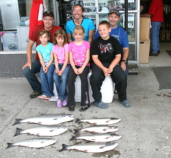 July 21 Wes Owens fishing with our clients Philip and Kathy Martens and their kids. The Marten kid's names are Brandon, Courtney, Brittney and Kimberly. Courtney, Brittney and Kimberly are triplet girls. Wow! Also in the group were John and Barb Froese and their son Tyson. The group caught two Coho, a Sockeye, four Pinks and a bunch of Crab on a half day charter in the Kitimat Harbour Fishery. Well done everyone! Congratulations!